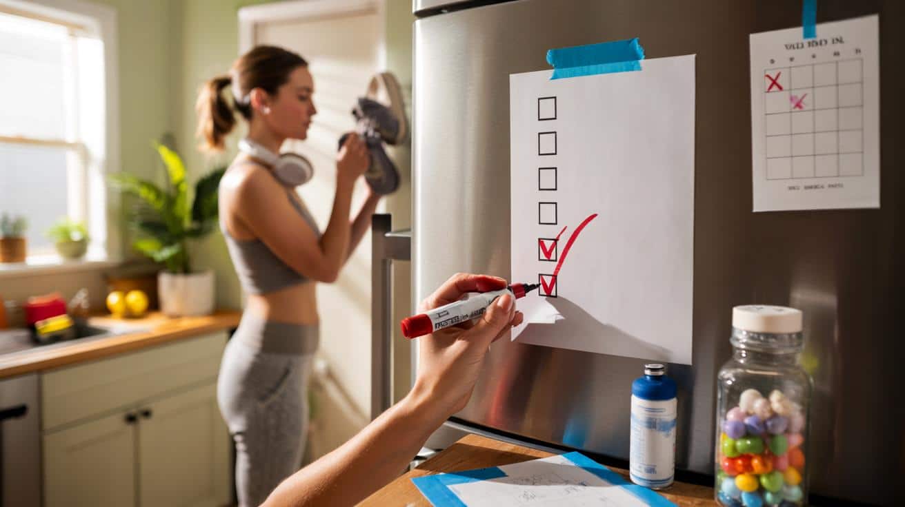 Jemand in einer WG-Küche klebt ein kleines, weißes Quadrat an den Kühlschrank, malt ein leeres Kästchen daneben und schreibt: „30 Minuten Bewegung“. Sie trinkt, starrt kurz aus dem Fenster, macht die Kopfhörer an und setzt einen Haken, bevor sie überhaupt joggen war. Ein Versprechen an sich selbst, sichtbar, nicht im Kopf vergraben. Später, nach dem Lauf, zeichnet sie den zweiten Haken. Man spürt fast, wie der Tag sich anders sortiert, wie die Motivation nachrückt, weil der Beweis an der Tür hängt. Kein App-Alarm, kein Sermon. Nur eine Linie, die sagt: Du bist dabei. Ein Strich genügt.