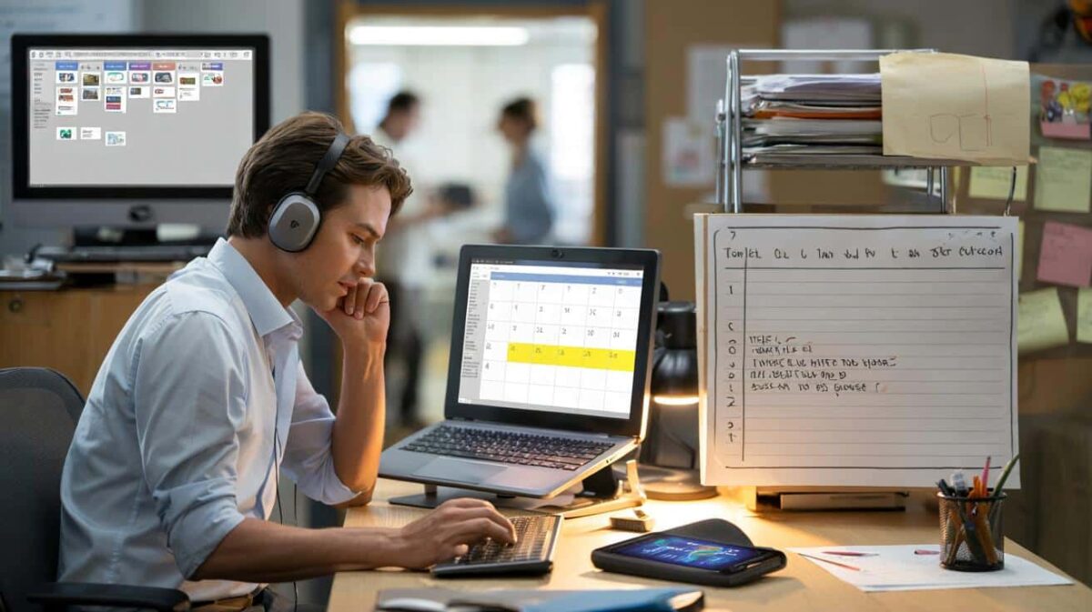 Jana sitzt im Großraumbüro, der Blick wandert zwischen To-do-Liste, Chatfenster und Kalender hin und her. Sie arbeitet, aber innerlich läuft