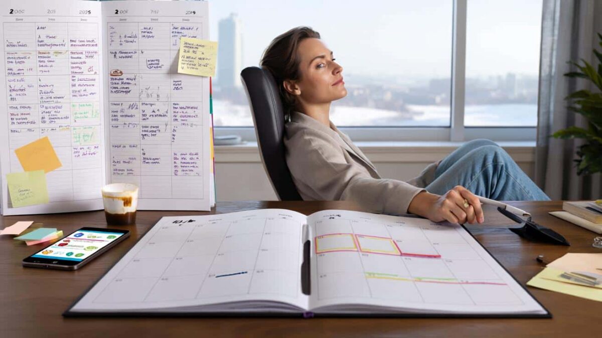 Auf deinem Schreibtisch liegt ein offener Kalender, drei To-do-Listen, daneben dein Handy mit sieben ungelesenen WhatsApp-Nachrichten. Du blätterst im Kalender